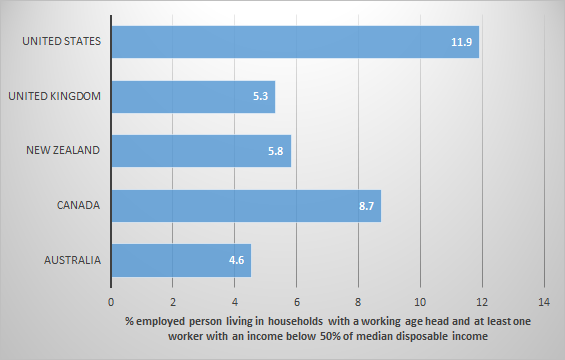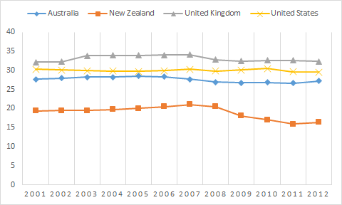 Figure 1: Direct taxes on the average worker in Australia, New Zealand, USA and UK, 2001 – 2012