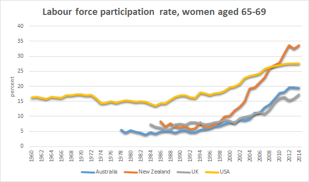 The phased increase in the eligibility age for the New Zealand old pension from 60 to 65 from the mid-1990s obviously carried through to the labour force participation of women over 65 as well.