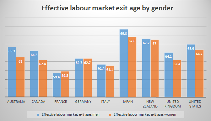 Effective labour market exit age by gender in the G7 countries, Australia and New Zealand