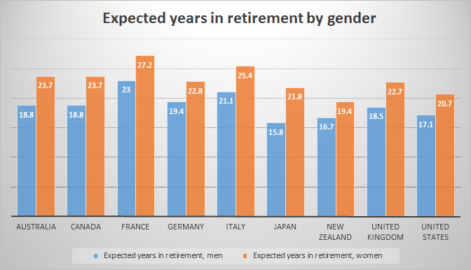 Expected years in retirement by gender in the G7 countries, Australia and New Zealand