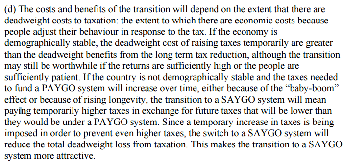 Constitutional political economy matters despite the reluctance of most who specialise in Social Security reform to think about that backend public choice risk. Unless there is iron-clad guarantee of lower taxes in the future, the whole deal about pre-funding superannuation pay-outs is a con.