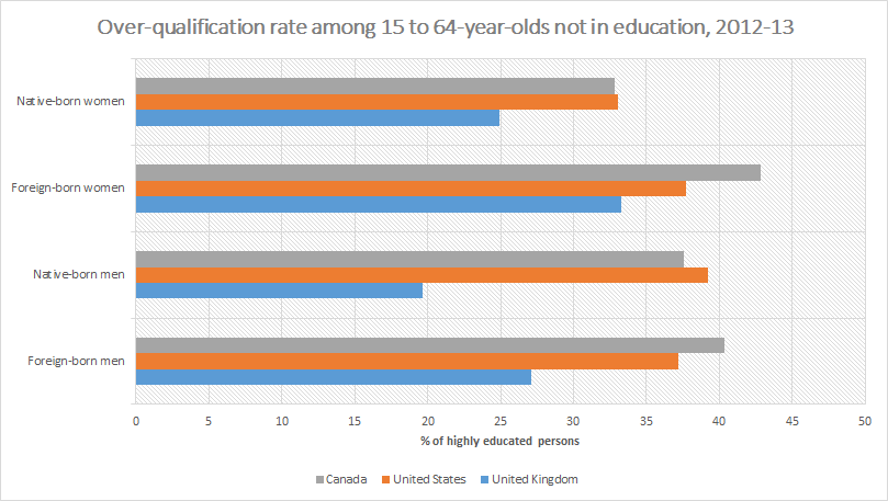 In the USA and Canada, there are few differences between native and foreign born men in over-qualification rates. Foreign-born women tend to be more over-qualified than native born women in the USA and more so in Canada. Many more workers are overqualified for their jobs in the USA and Canada as compared to the UK.