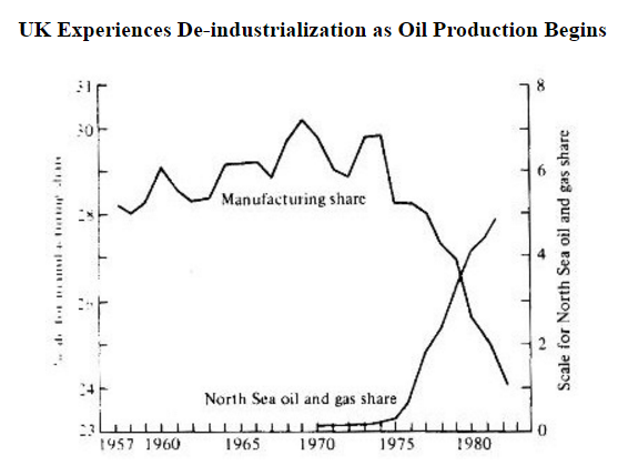 In the late 1970s and early 80s, the UK experienced similar de-industrialization under a floating exchange rate regime. They discovered and exploited the North Sea oil fields. Since the global oil price was rising, the UK was expected to earn a great amount of foreign exchange in the future. But even before these earnings were realized, the British pound appreciated suddenly in both nominal and real terms. This damaged the British manufacturing sector.