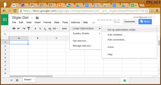 The always excellent Matthew Kahn reminded me today of the Stigler diet: George Stigler’s famous 1945 journal article The Cost of Subsistence in the Journal of Farm Economics. Stigler posed this problem: