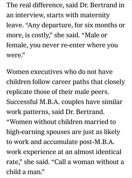 Claudia Goldin did a great study of Harvard MBAs using online surveys of their careers. This is the very group that according to the Economic Policy Institute have made the least progress in bringing down patriarchy in the labour market. Specifically, the overturning of traditional expectations about the marital division of labour in childcare and parenthood.