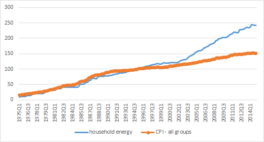 Figure 2: Household energy price index and consumer price index – all groups, March quarter 1975 – March quarter 2015, base = 1995