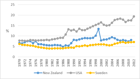 Figure 1: Top 1% income shares, USA, New Zealand and Sweden, 1970-2012