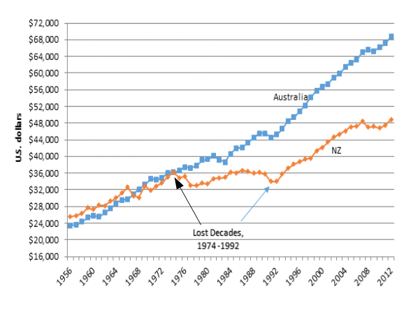 Figure 1 shows that New Zealand lost two decades of growth between 1974 and 1992 after level pegging with Australia for the preceding two decades.