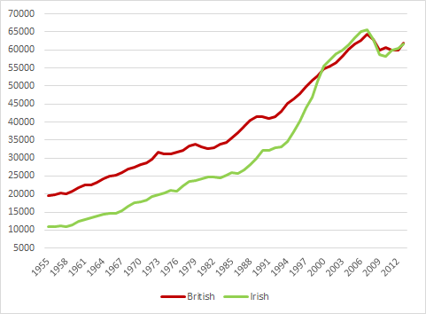 Figure 2: Real GDP per British and Irish aged 15-64, converted to 2013 price level with updated 2005 EKS purchasing power parities, 1.9 per cent detrended UK, 3.6% detrended Ireland, 1955-2013