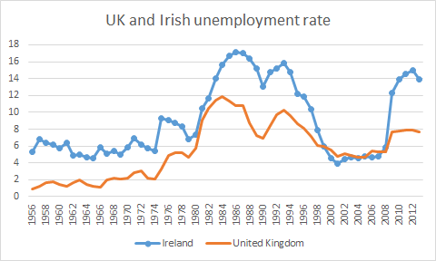 Ireland and Britain justly earned the name the sick man of Europe in the 1980s. Irish unemployment was in the mid teens much of the 1980s because the Irish economy was in a great depression from 1973 to 1992.