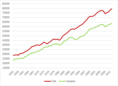 Figure 1: Real GDP per American and Canadian aged 15-64, converted to 2013 price level with updated 2005 EKS purchasing power parities, 1955-2013