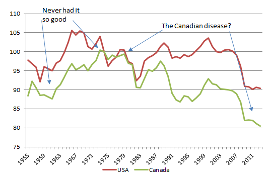 Canada has a volatile ride in the post-war period after economic success up until 1975. Despite ups and downs the Canadian economy has been in a long-term decline since 1975. Growth as rarely being at trend and was often below, sometimes sharply below trend.