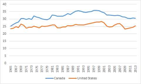 Figure 3 suggests that the increase in tax revenues as a percentage of GDP from 30% to 35% at the same time as the Canadian economic boom came to an end and its economic decline began is worthy of further scrutiny. The strong economic recovery from 1995 onwards also coincided with the decline tax revenues as a percentage of GDP.