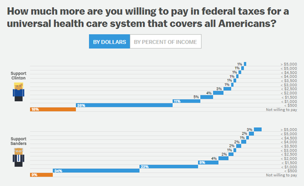 66 percent of Sanders supporters are unwilling to pay more than $1,000 in higher taxes for universal health care. This includes the 8 percent of Sanders supporters who aren’t willing to pay anything more!