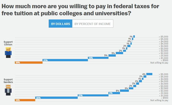 Sanders supporters want free public college tuition but 14 percent said they don’t want to pay additional taxes for it; another half said they would only pay up to $1,000 a year!