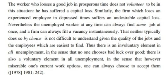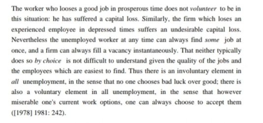 Thus there is an involuntary element in all unemployment, in the sense that no one chooses bad luck over good; there is also a voluntary element in all unemployment, in the sense that however miserable one’s current work options, one can always choose to accept them.”