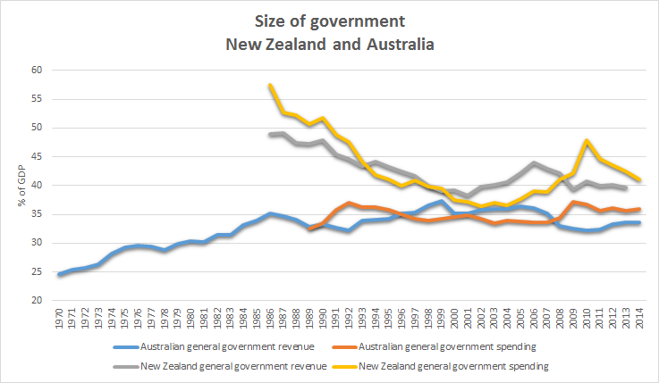 I do not trust the numbers for New Zealand prior to the early 1990s released by the OECD. New Zealand simply did not have a tax structure including a GST in the double digits back then to support estate of that size. Nonetheless, the size of government in New Zealand is systematically larger than in Australia, a richer country which can afford a large government and generous welfare state.