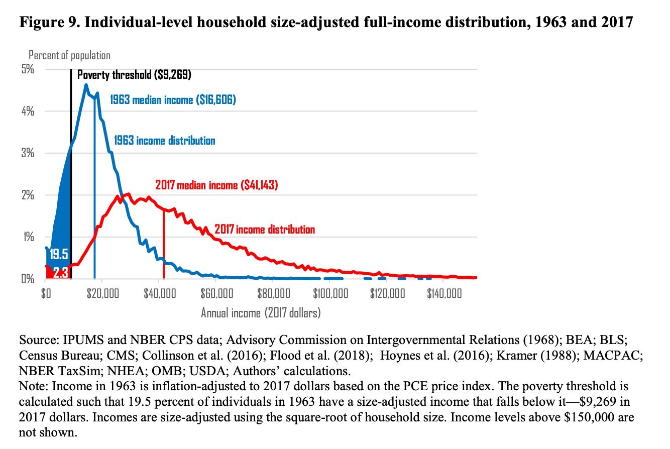In the early 1960s allowing for all benefits, 19.5 % of Americans lived on less than $9,269 2017-dollars per annum. Today only 2.3% do. This @nberpubs