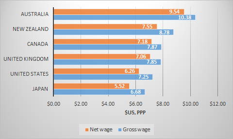 Hourly minimum wages before and after taxes, USA, UK, Canada, Australia, New Zealand and Japan