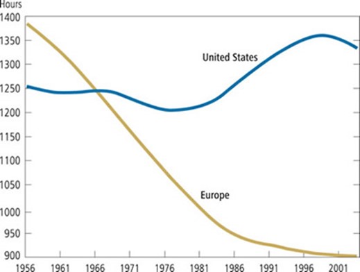Large increases in taxes on income from labour since the 1970s, enhanced incentives for retire early, and the interaction of generous employment insurance with the larger skill losses among workers displaced by the greater economic turbulence since 1980 all acted to reduce both real GDP and hours worked per week per working age person by up to a third in Western Europe as compared to the USA since the 1970s (Prescott 2004, 2007; Rogerson 2006, 2008; Ohanian et al. 2008; Ljungqvist and Sargent 1998, 2007, 2008). For example, Ohanian, Rao and Rogerson 2008 in “Work and taxes: allocation of time in OECD countries” found that: