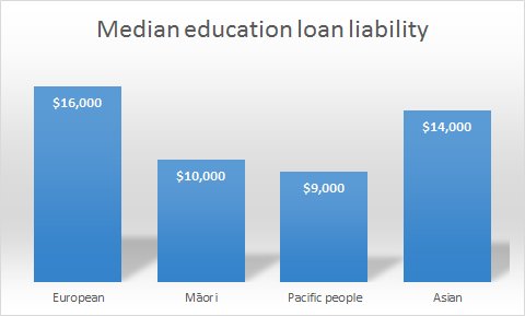 Median education loan liabilities are only one-tenth of Pākehā people’s median assets, but they are a quarter of Māori people’s assets and over a third of Pacific people’s assets (table 7.01).