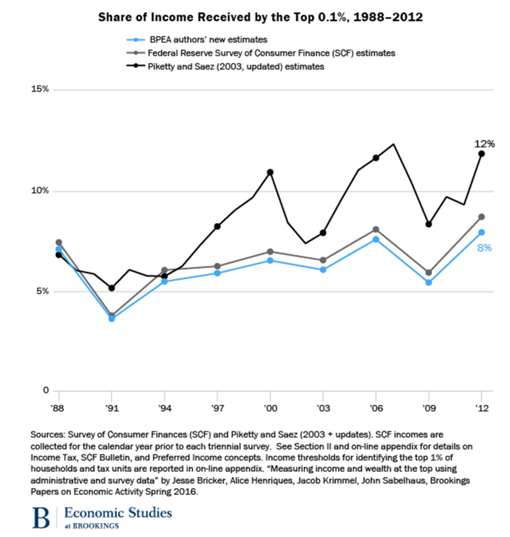 Piketty and Saez (2003, updated) estimated the share of income held by the top 1% from 13 percent in 1991 to 23 percent in 2012. The new Bricker et al. research shows only a 7 percentage point increase to 18 percent in 2012. The share held by the super-rich, the top 0.1% has increased much at all.