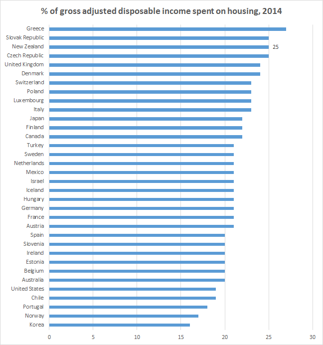 New Zealand is pretty much on top of the world as to the amount of income that households must spend keep a roof. That success is a product of local council restrictions on the supply of land and national and local regulations such as under the Resource Management Act (RMA) that increase the costs of bringing lands in the market.