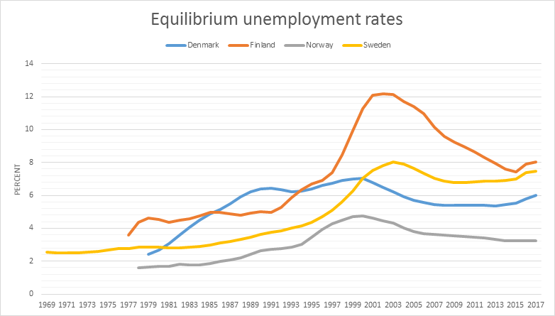 Equilibrium unemployment rates are creeping up on all Scandinavian countries bar Norway.