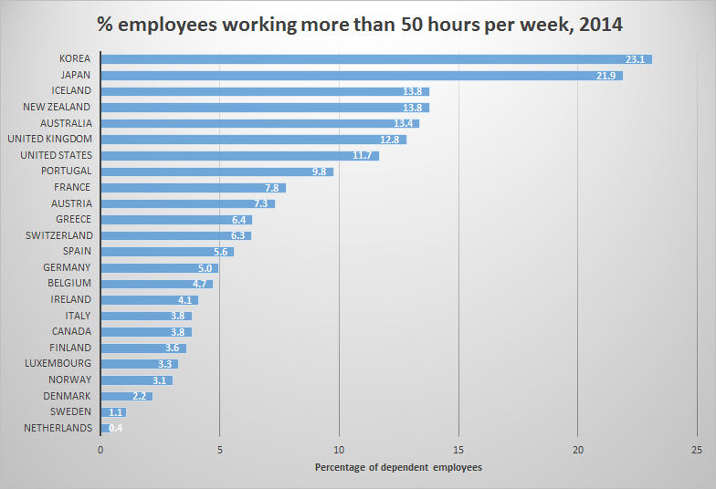 % employees working more than 50 hours per week, 2014 OECD area