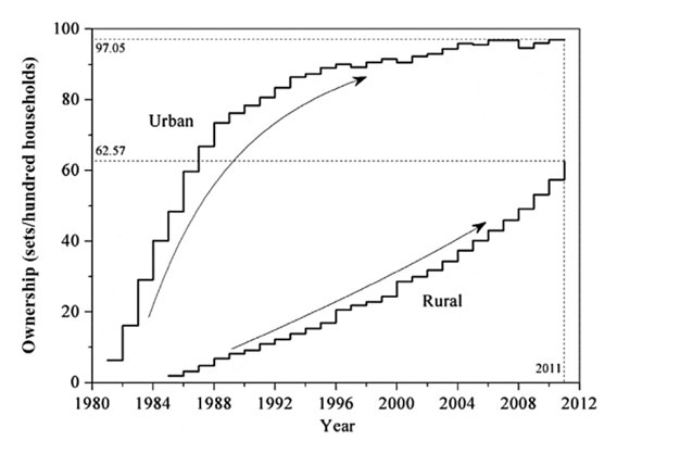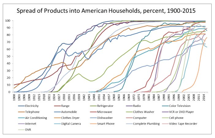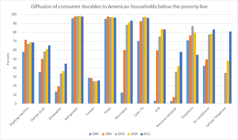 In the 2000s, dishwashers, air conditioning and microwaves were still diffusing rapidly in poor households in addition to the usual digital goods.