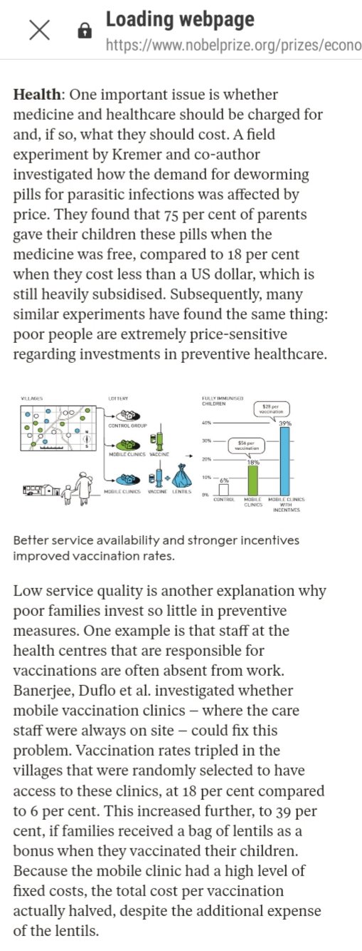 Nobel prize for discovering if you subsidise something, you see more of it!! Many years worth of randomized controlled trials just to make sure in dirt poor countries. Didn’t know child vaccination payoffs so marginal that you had to check.