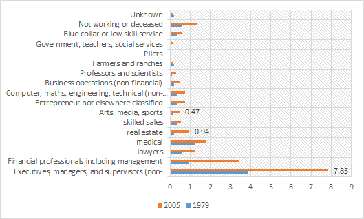 Figure 1: Percentage of national income (including capital gains) received by top 1%, and each primary taxpayer occupation in top 1%, USA