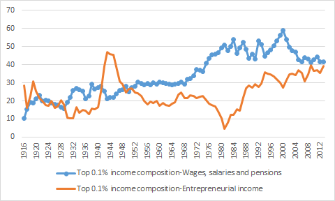 Before 1940, most of the income of the top 0.1% of income earners in the USA was income from investments. By the end of the 20th century, the top 0.1% were earning their incomes as wages and salaries, business incomes and capital gains. Very little of that income of the top 0.1% was in the form of passive income from capital. The top 0.1% of the USA are now working rich – entrepreneurs.