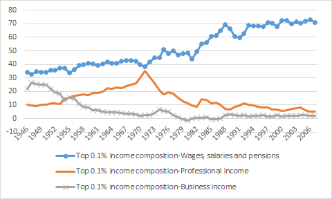 Figure 3: percentage of top 0.1% with wage salary and pension incomes, business incomes and professional incomes, Canada, 1946 – 2007