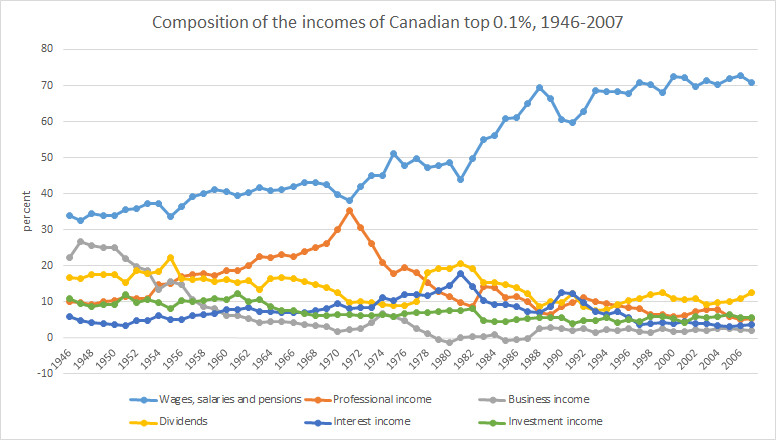 The rise of the Canadian working super-rich – composition of top 0.1% incomes since 1946