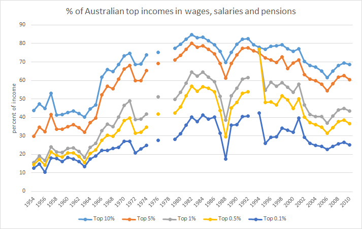 Over the course of the post-war period top incomes in Australia turned into top wage earners. It is unfortunate that information is not available on the extent to which business incomes make up the balance of top incomes as distinct from dividend incomes.