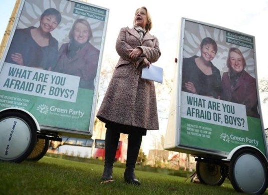 The sign of the UK Greens borders on hate speech. The UK Greens also do not have female and male co-leaders, as is the case for the New Zealand Greens, from what I can see – where is their gender balance?