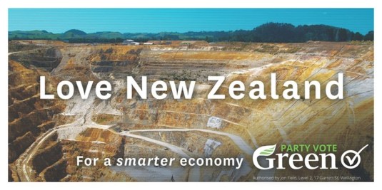 The New Zealand Greens have election campaign signs from which I can neither discern their message, nor easily work out that it is a Green sign because their logo is so small in the bottom right hand corner when driving by a car.