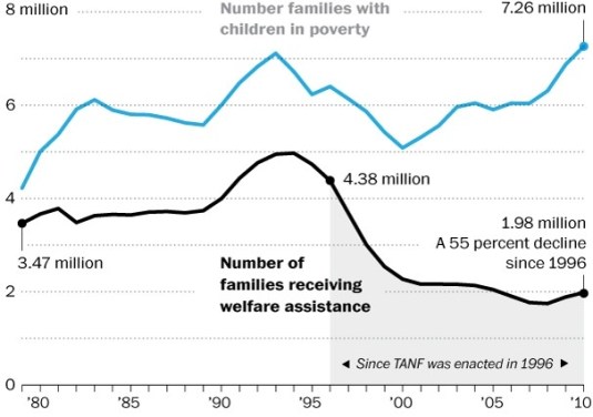 The gains in U.S. employment after the 1996 Federal welfare reform were largest among the single mothers previously thought to be most disadvantaged: young (ages 18-29), mothers with children aged under seven, high school drop-outs, and black and Hispanic mothers. These low-skilled single mothers in the USA were thought to face the greatest barriers to employment.